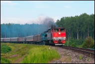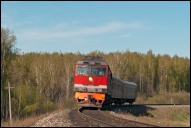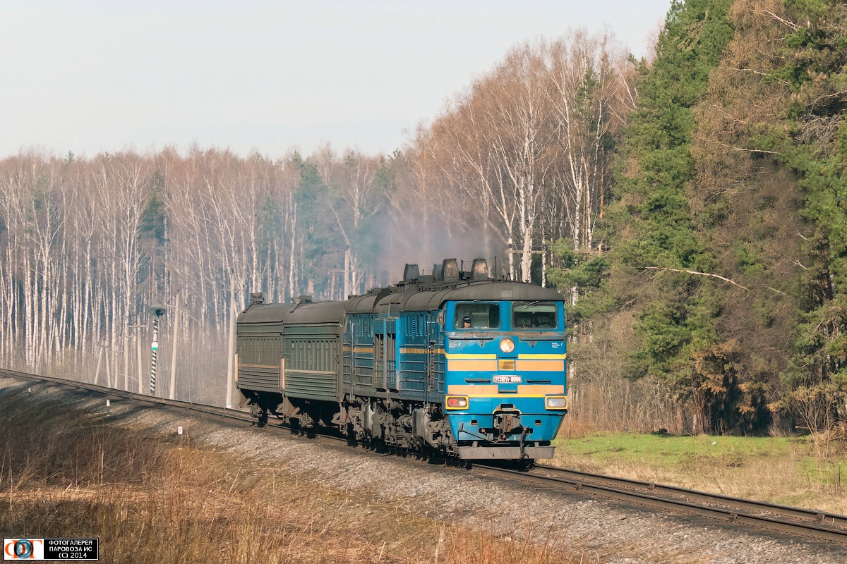| Тепловоз 2ТЭ10УТ-0099Б в голове пригородного поезда Кострома - Галич, перегон Кострома-Новая - Сендега, Костромская обл. Автор: Прок@зник | Фото сделано 27.IV.2014, опубликовано 3.VIII.2014.