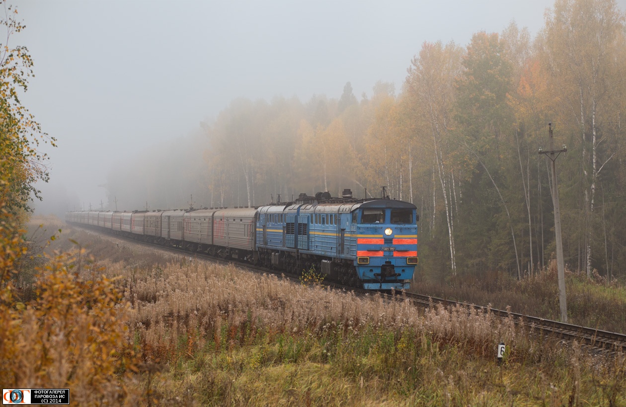 | Тепловоз 2ТЭ10УТ-0052 с поездом Москва - Хабаровск, перегон Судиславль - Первушино, Костромская обл. Автор: Lelik | Фото сделано 27.IX.2014, опубликовано 3.X.2014.