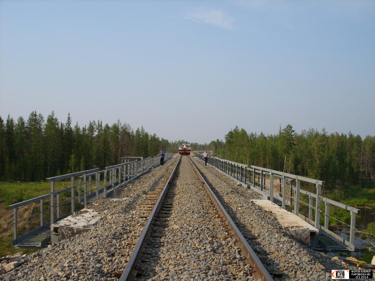 | Автомотриса АС5 с бригадой путейцев на мосту через реку Улахан-Тарынг, перегон Кердем - Нижний Бестях, ЖДЯ, Якутия Автор: Андрей | Фото сделано 16.VII.2014, опубликовано 10.X.2014.
