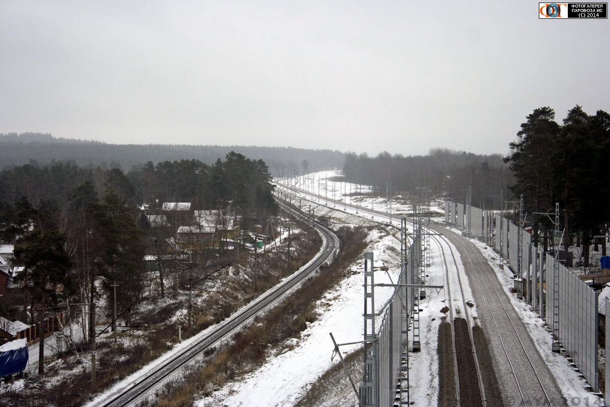 | Вид с моста через реку Вуокса на перегон Лосево-I - Громово (слева) и начало будущей линии Лосево-I - Каменногорск (справа), Ленинградская обл. Автор: mYm | Фото сделано 28.XI.2014, опубликовано 18.XII.2014.