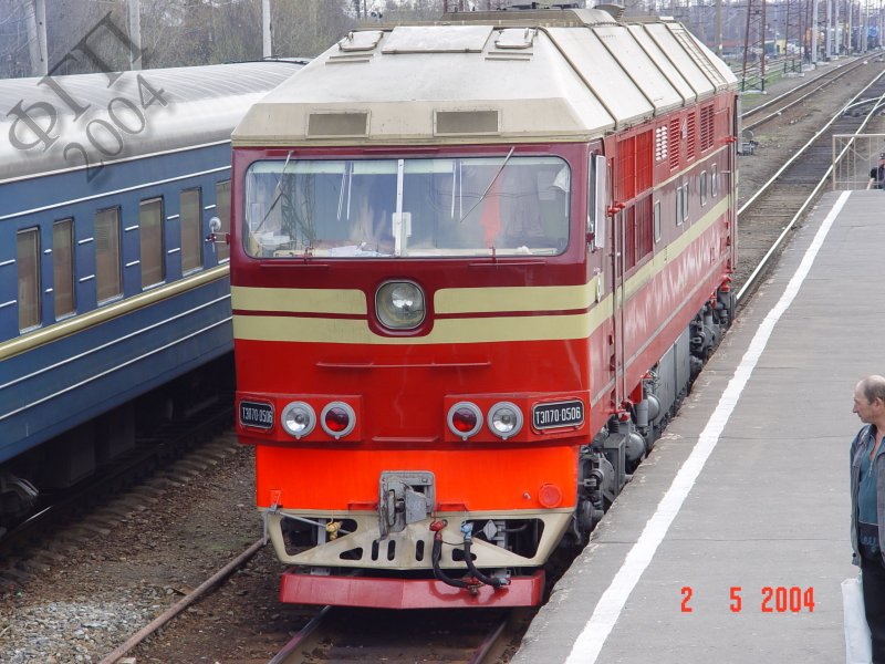 | Тепловоз ТЭП70-0506 { TEP70-0506 diesel locomotive }, ст. Ожерелье { Ozherelye station }, Московская обл. Автор: Котов Олег | Фото сделано 2.V.2004, опубликовано 6.V.2004.