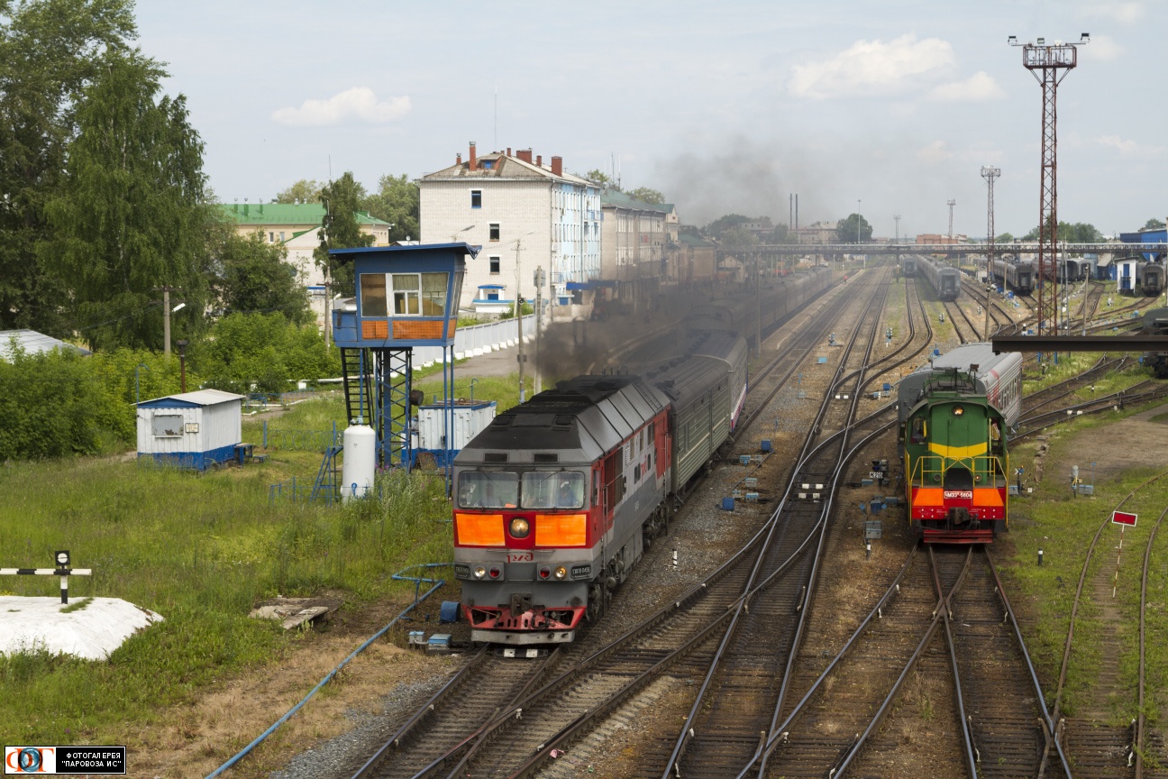 | Тепловоз ТЭП70-0456 в голове поезда № 376 Москва - Воркута и тепловоз ЧМЭ3Т-5804, станция Котлас-Южный, Архангельская обл. Автор: Максимов Юрий | Фото сделано 15.VII.2017, опубликовано 18.VIII.2017.