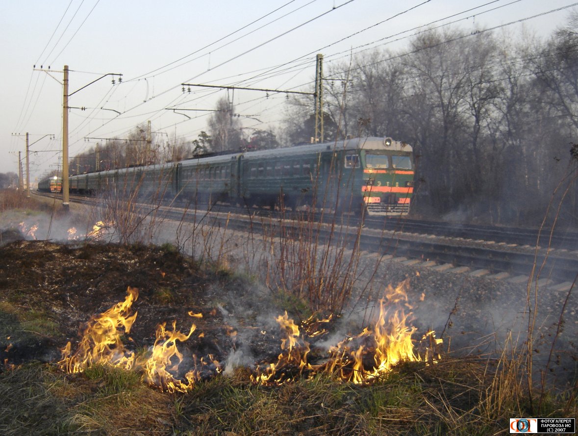 ) Поэтому я назвал фотографию: "Э Т О т поезд в огне". Кстати, сами поджигатели мне встретились через несколько минут после этого снимка. А еще через три дня, помню, на этом же направлении, на участке Фрязево - Казанское горела трава вдоль ж/д на протяжении метров 500, да так сильно, что приехала "газель" МЧС, на которой было написано "01" и "Мособлспас".