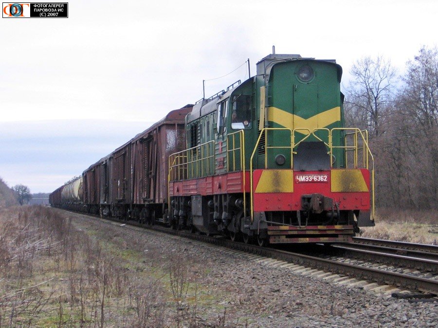 | Тепловоз ЧМЭ3Т-6362 с грузовым поездом, участок Черкассы - рзд. 898 км, Черкасская обл. Автор: Net | Фото сделано 9.I.2007, опубликовано 10.I.2007.