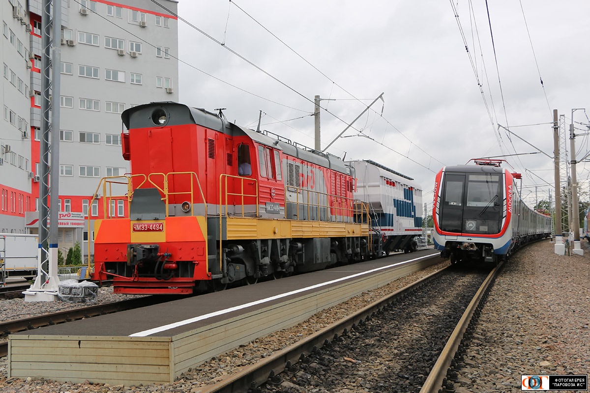 | Тепловоз ЧМЭ3-4494 с вагоном-хоппером и метропоезд "Москва" на репетиции динамического показа техники на выставке "ЕХРО-1520" на ЭК ВНИИЖТ, Щербинка, Москва Автор: Юрий | Фото сделано 29.VIII.2017, опубликовано 18.I.2018.