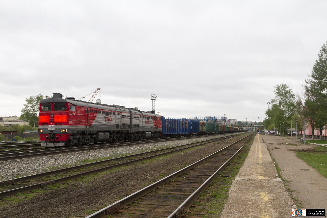 | Тепловоз 2ТЭ10М-0355 в голове грузового поезда, станция Киров-Котласский, Кировская обл. Автор: Максимов Юрий | Фото сделано 20.V.2018, опубликовано 30.V.2018.