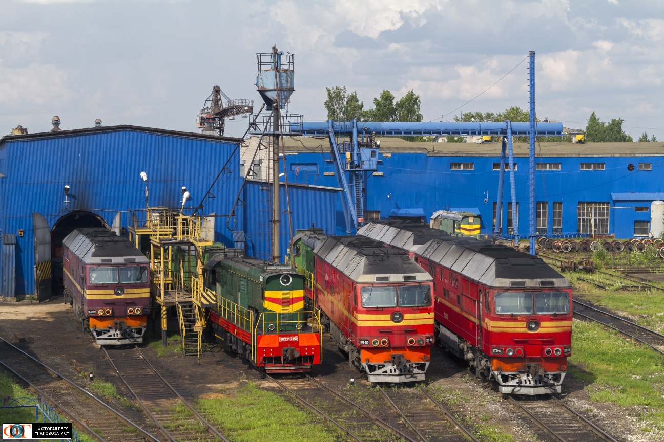 | Тепловозы ТЭП70-0573, ЧМЭ3Т-7450, ТЭП70-0533, ТЭП70-0439 в депо Котлас, Архангельская обл. Автор: Максимов Юрий | Фото сделано 17.VII.2017, опубликовано 21.VIII.2019.