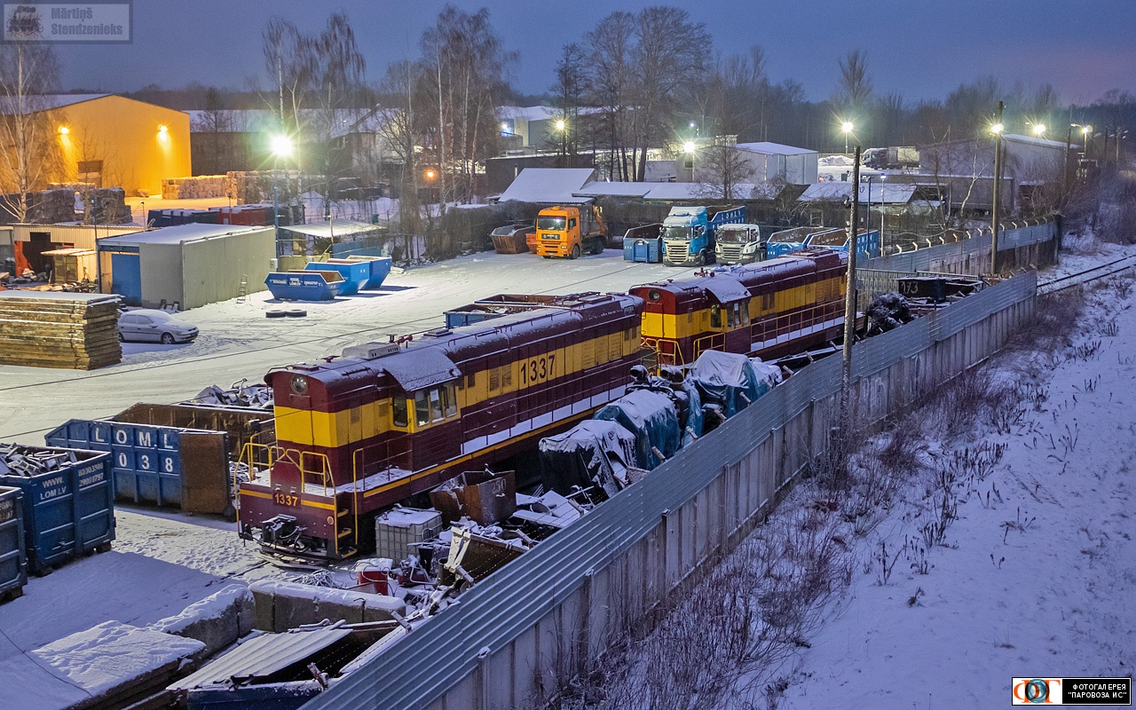 | Тепловозы ЧМЭ3-5380 и ЧМЭ3-3966 на металлобазе, подъездной путь от станции Ильгуциемс, Латвия Автор: Mārtiņš Stendzenieks | Фото сделано 12.I.2022, опубликовано 15.I.2022.