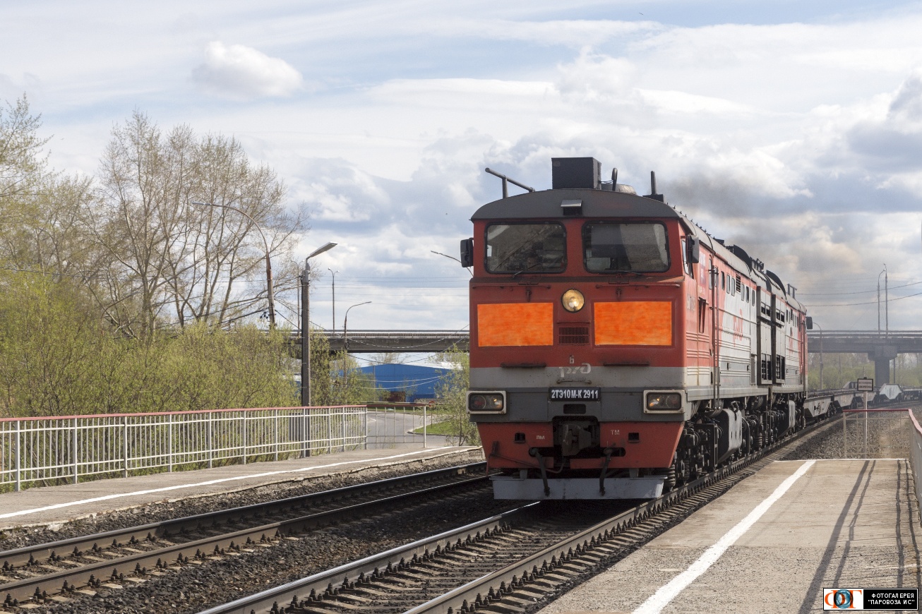 | Тепловоз 2ТЭ10МК-2911 в голове грузового поезда, о.п. Лесозавод, перегон Бакарица - Архангельск-Город, Архангельская обл. Автор: Максимов Юрий | Фото сделано 29.V.2022, опубликовано 12.IX.2022.