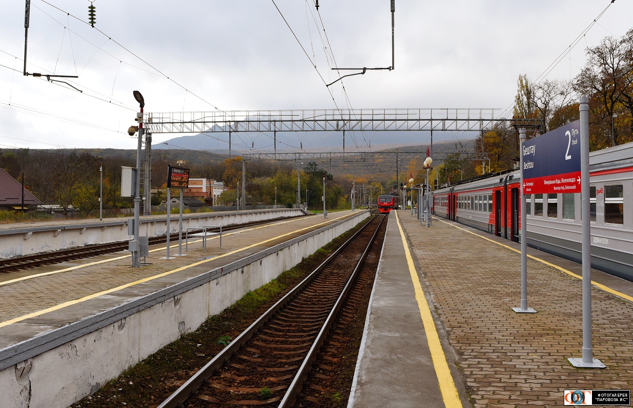 - 1. Спасибо! Да, время в камере отстало - электропоезда шли по расписанию, я ехал как раз в правой электричке Кисловодск - Железноводск. Я тут был впервые, было неожиданно, что от ст. Лермонтовский до ст. Бештау ехали по встречному пути (оказывается, только с него есть съезд на Железноводскую ветку), вдобавок ещё по правильному пути нас обогнала "Ласточка" на Минеральные Воды, смотрелось необычно для двухпутной линии. -- Сергей Николаев