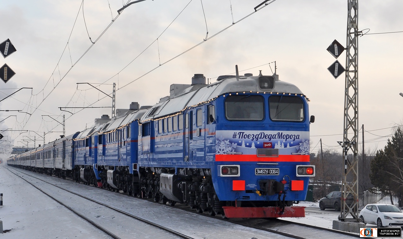 | Тепловоз 3М62У-0064 с поездом Деда Мороза на перегоне Омск-Пассажирский - Московка, Омская обл. Автор: Гольбрайхт М. | Фото сделано 1.XII.2023, опубликовано 21.II.2025.